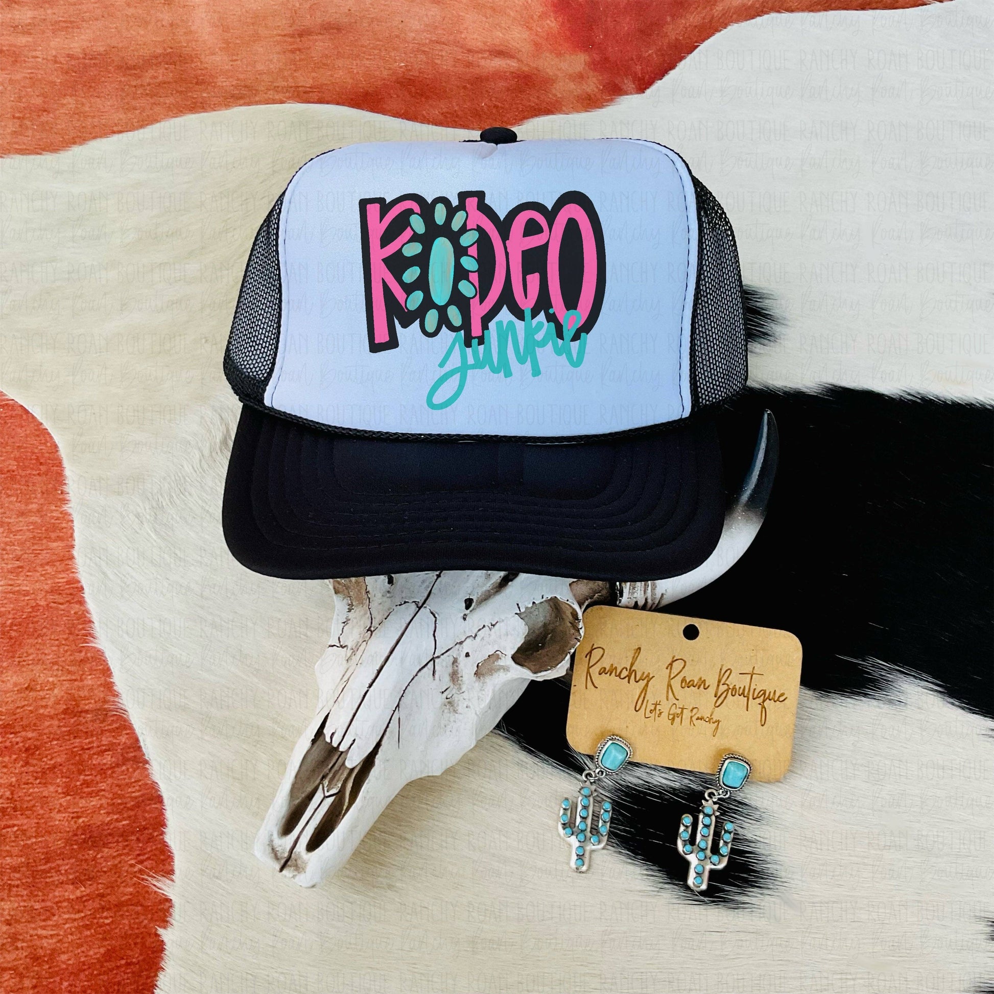 Embrace your love for the rodeo with our “Rodeo Junkie Foam Front Trucker Hat” from Ranchy Roan Boutique. This stylish hat features a vibrant sublimation print with bold text and fun colors, making it a perfect addition to any Western boutique’s collection.